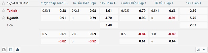 Tip kèo Châu Á hiệp 1 Tunisia vs Uganda