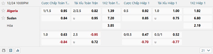 Tip kèo Châu Á hiệp 1 Algeria vs Sudan