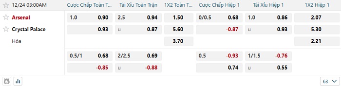 Tip kèo Châu Á full trận Arsenal vs Crystal Palace