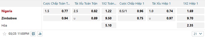 Tip kèo Châu Á hiệp 1 Nigeria vs Zimbabwe