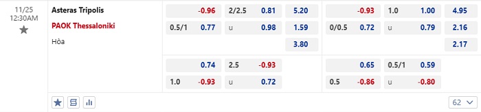 Tip kèo Châu Á hiệp 1 Asteras vs PAOK