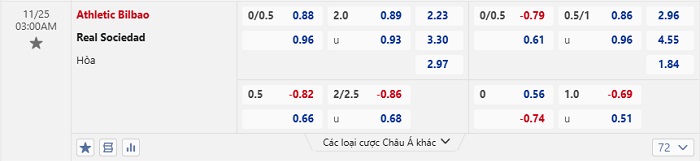 Tip kèo Châu Á full trận Athletic Bilbao vs Real Sociedad