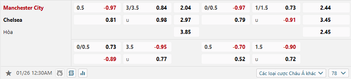 Tip kèo Châu Á hiệp 1 Man City vs Chelsea