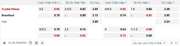 Tip kèo Châu Á hiệp 1 Crystal Palace vs Brentford