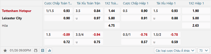 Tip kèo Châu Á hiệp 1 Tottenham vs Leicester