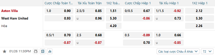 Tip kèo Châu Á hiệp 1 Aston Villa vs West Ham