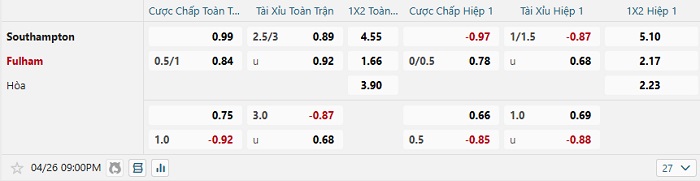 - Dự đoán tỷ số hiệp 1: Southampton 0 – 1 Fulham