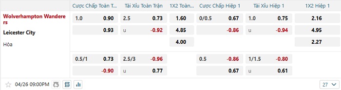 - Dự đoán tỷ số hiệp 1: Wolves 0 – 0 Leicester