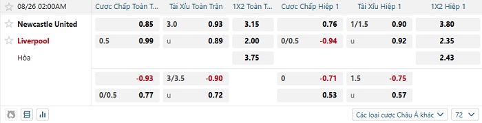 Tip kèo Châu Á full trận Newcastle vs Liverpool