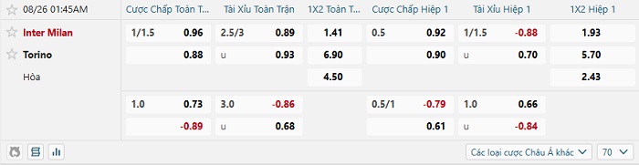 Tip kèo Châu Á full trận Inter Milan vs Torino