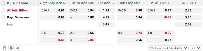Tip kèo Châu Á hiệp 1 Bilbao vs Vallecano