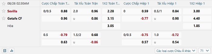 Tip kèo Châu Á hiệp 1 Sevilla vs Getafe