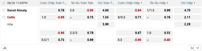 Nhận định trận đấu Kairat Almaty vs Celtic: Áp đảo đối thủ hoàn toàn ở mọi khía cạnh, Celtic hôm nay tự tin có cho mình 1 chiến thắng trọn vẹn tại sân của Kairat. Ngay cả khi Celtic đã gần như chắc chắn đi tiếp, sự vượt trội của họ cũng giúp cho đội bóng này trở thành lựa chọn đầu tư an toàn nhất ở mức chấp -1. Ngoài ra thì do cả hai đều đã biết trước kết quả, trận đấu này sẽ có ít bàn thắng do họ không còn sự quyết tâm.