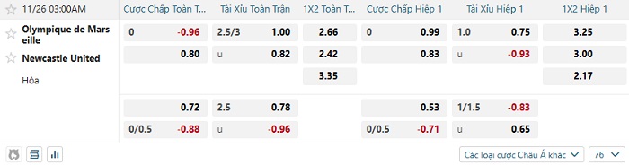 Tip kèo Châu Á hiệp 1 Marseille vs Newcastle