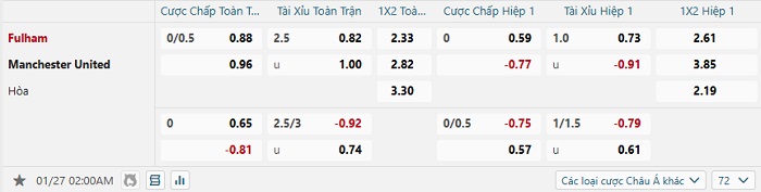 Tip kèo Châu Á hiệp 1 Fulham vs Man United