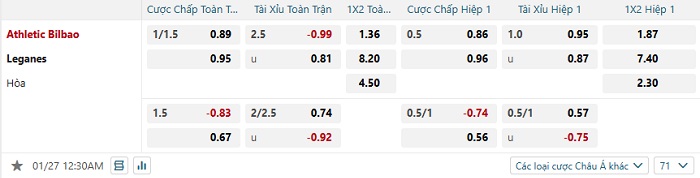 Tip kèo Châu Á hiệp 1 Athletic Bilbao vs Leganes