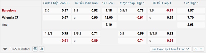 Tip kèo Châu Á full trận Barcelona vs Valencia