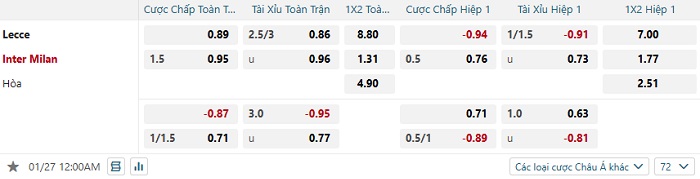 Tip kèo Châu Á hiệp 1 Lecce vs Inter Milan