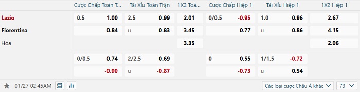 Tip kèo Châu Á hiệp 1 Lazio vs Fiorentina