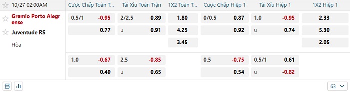 Tip kèo Châu Á hiệp 1 Gremio vs Juventude