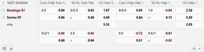 Tip kèo Châu Á hiệp 1 Botafogo vs Santos
