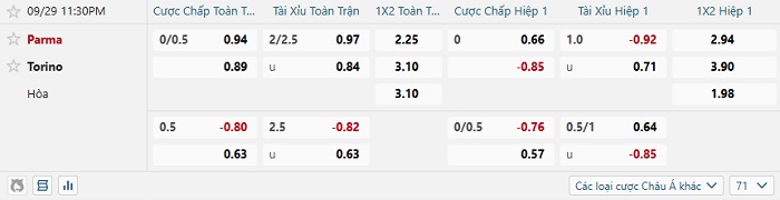 Tip kèo Châu Á hiệp 1 Parma vs Torino