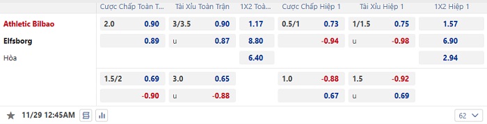 Tip kèo Châu Á hiệp 1 Bilbao vs Elfsborg