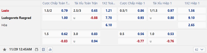 Tip kèo Châu Á full trận Lazio vs Ludogorets