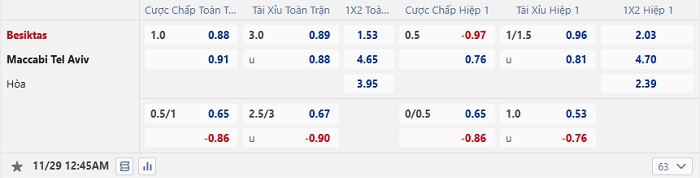 Tip kèo Châu Á hiệp 1 Besiktas vs Maccabi Tel Aviv