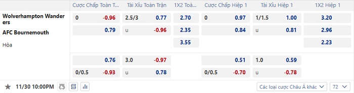 Tip kèo Châu Á full trận Wolves vs Bournemouth