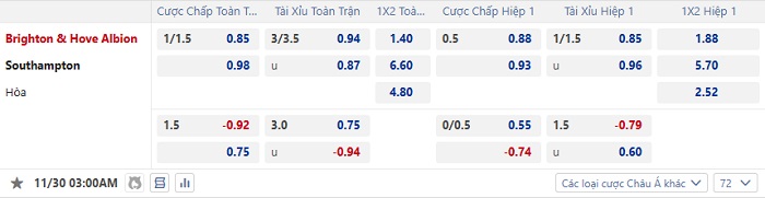 Tip kèo Châu Á full trận Brighton vs Southampton