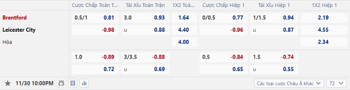 Tip kèo Châu Á full trận Brentford vs Leicester