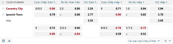Tip kèo Châu Á hiệp 1 Coventry vs Ipswich