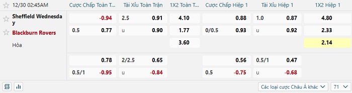 Tip kèo Châu Á full trận Sheffield Wed vs Blackburn