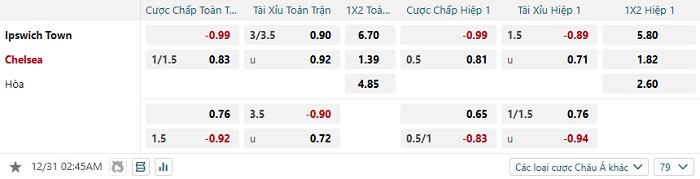 Tip kèo Châu Á hiệp 1 Ipswich vs Chelsea