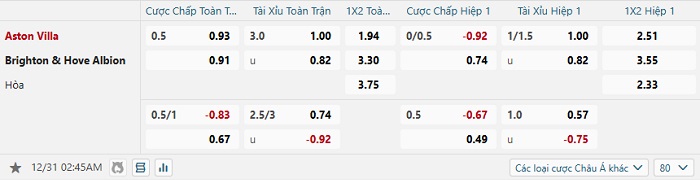 Tip kèo bóng đá trận Aston Villa vs Brighton 02h45 ngày 31/12/2024 Ngoại Hạng Anh
