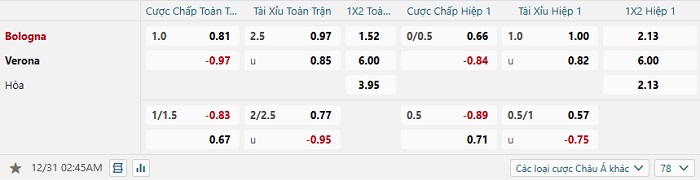 Tip kèo Châu Á full trận Bologna vs Verona