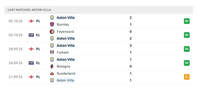- Phong độ gần đây Aston Villa