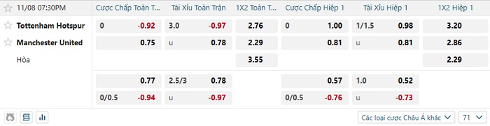 Bảng tỷ lệ kèo bóng đá hôm nay Tottenham vs Man Utd