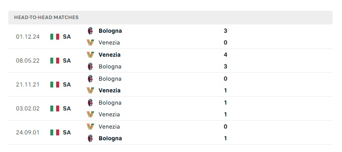 Lịch sử đối đầu Venezia vs Bologna