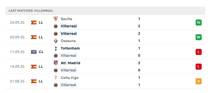 • Phong độ gần đây Villarreal