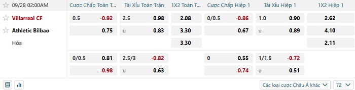 Bảng tỷ lệ kèo bóng đá Villarreal vs Athletic Bilbao