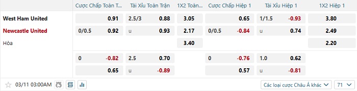 Bảng tỷ lệ kèo bóng đá West Ham Utd vs Newcastle