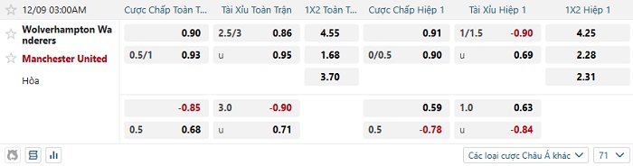 Bảng tỷ lệ kèo bóng đá Wolves vs Manchester Utd