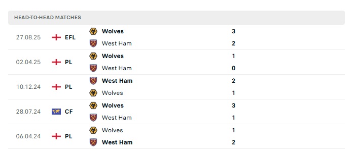 Lịch sử đối đầu Wolves vs West Ham Utd