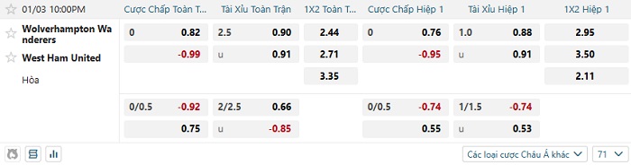 Bảng kèo bóng đá Wolves vs West Ham Utd